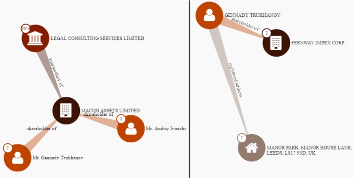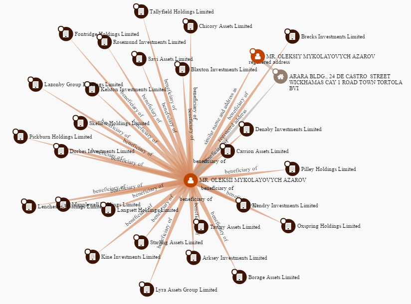 Также в архиве числятся 26 компаний, которые зарегистрированы на экс-премьера Николая Азарова - Алексея. Кроме этого, в базе данных можно найти компании, зарегистрированные на Петра Порошенко, Павла Лазаренко, Бориса Ложкина и Генадия Труханова.