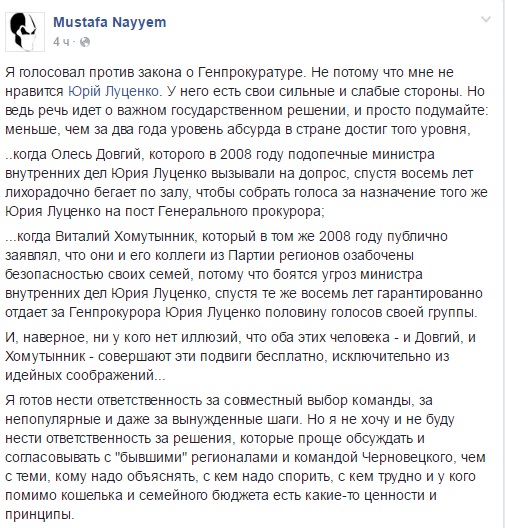 Народный депутат Украины, замглавы фракции БПП Мустафа Найем заявил о том, что он голосовал против закона о Генпрокуратуре, так как он является абсурдным.