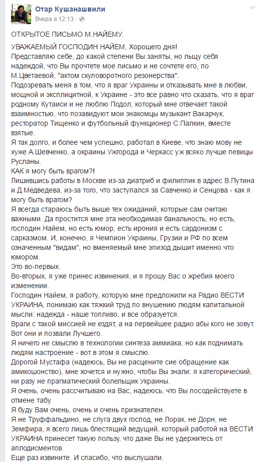 На своей странице в социальной сети Facebook Кушанашвили разместил письма, направленные к украинским политикам и чиновникам.