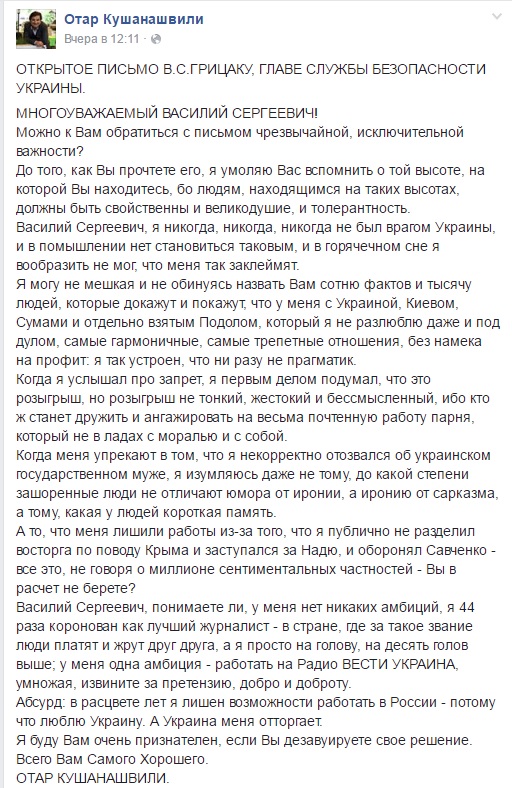 В своих посланиях, Отар жалуется, что в России ему не дают работать, а кормить семью чем-то надо, а так как он любит Украину, то просит, чтобы официальный Киев аннулировал запрет на въезд журналисту.