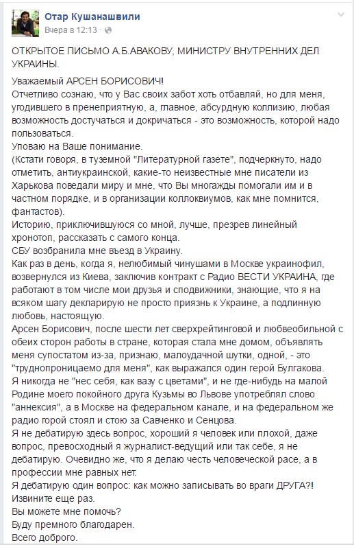 Известный российский шоумен Отар Кушанашвили обратился к главе СБУ Василию Грицаку, министру МВД Арсену Авакову и заместителю главы фракции БПП Мустафе Найему с просьбой отменить ему запрет на въезд в Украину.