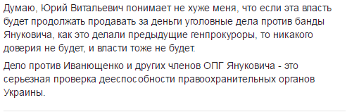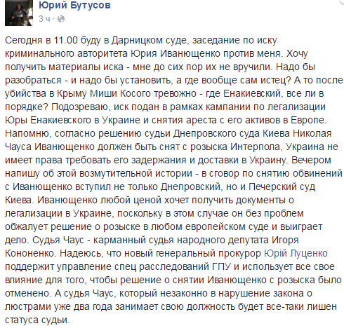"Украина не имеет права требовать его задержания и доставки. В сговор по снятию обвинений криминального авторитета вступил не только Днепровский, но и Печерский суд Киева. Чаус – это карманный судья нардепа Игоря Кононенко. Надеюсь, что Генпрокурор Луценко поддержит управление спецрасследований ГПУ и использует все свое влияние для того, чтобы решение о снятии Иванющенко с розыска было отменено", - написал Юрий Бутусов.