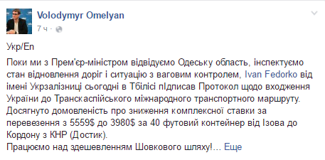 По словам главы министерства инфраструктуры Украины, во время посещения его и украинского премьера Одесской области представитель "Укрзализныци" Иван Федорко в Тбилиси подписал документ, в соответствии с которым Украина войдет в Транскаспийский международный транспортный маршрут.