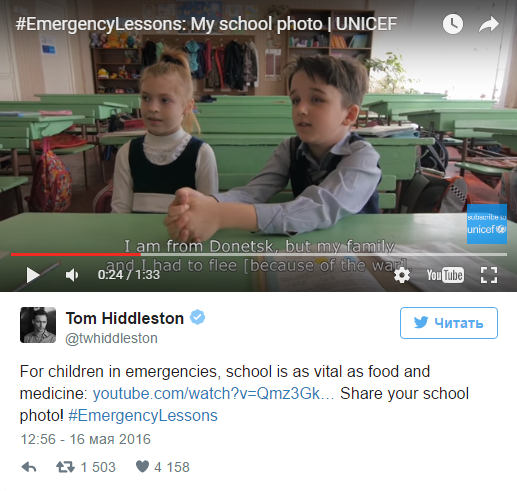 Как стало известно, 35-летний знаменитый британский актер Том Хиддлстон, являющийся послом доброй воли ЮНИСЕФ, был тронут историей украинских школьников с Донбасса, которые вынуждены были покинуть территорию оккупированного боевиками региона.