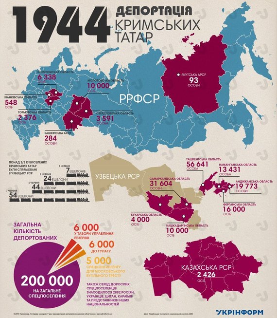 18 мая 1944 года в Среднюю Азию из Крыма был отправлен первый эшелон крымских татар. Почти 200 тысяч татар были вынуждены покинуть свои дома. В пути погибла почти половина этих людей.