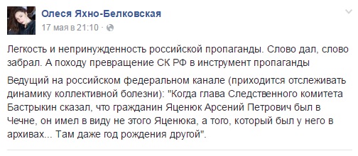 "Ведущий на российском федеральном канале (приходится отслеживать динамику коллективной болезни): "Когда глава Следственного комитета Бастрыкин сказал, что гражданин Яценюк Арсений Петрович был в Чечне, он имел в виду не этого Яценюка, а того, который был у него в архивах... Там даже год рождения другой".", - пишет эксперт.