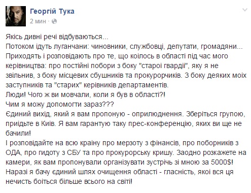 Заместитель министра по вопросам оккупированных территорий и экс-глава Луганской ОВГА Георгий Тука приглашает всех луганчан, которые желают бороться против коррупции, в Киев.