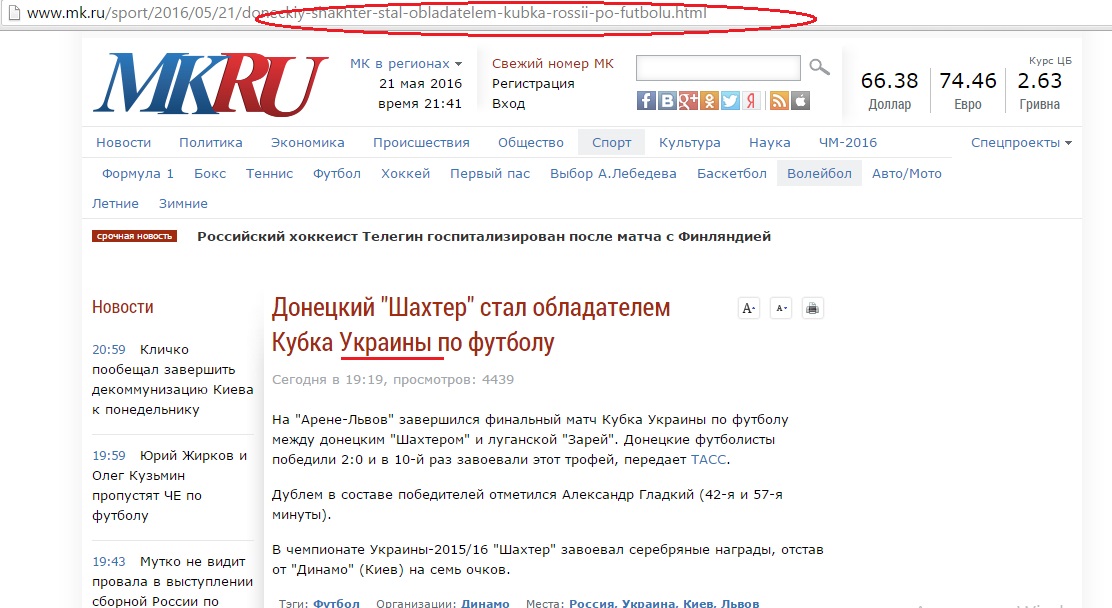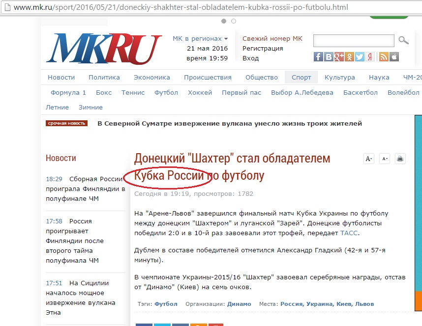 Вечером 21 мая известное российское издание "Московский комсомолец" попало в курьезную ситуацию. Сообщая о результатах финального поединка Кубка Украины между донецким "Шахтером" и луганской "Зарей", журналисты написали, что "Шахтер" стал обладателем… Кубка России по футболу.