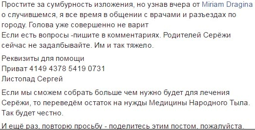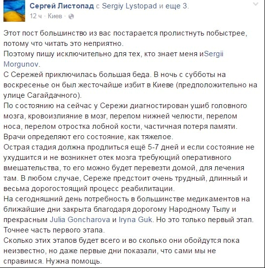 "Врачи определяют его состояние как тяжелое. Нужно очень много средств, чтобы его вытянуть. Два года рисковать, получить осколок или пулю от снайпера, а в итоге пострадать от каких-то ублюдков в центре Киева", – резюмирует Листопад.