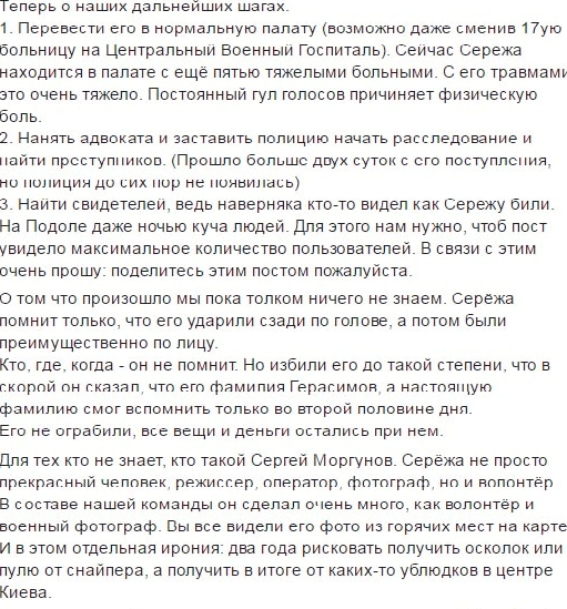Банда напала на известного волонтера и фотографа Сергея Моргунова в районе Подола. Друг пострадавшего пишет, что пока толком ничего не известно, сам пострадавший дал скудные данные об инциденте.
