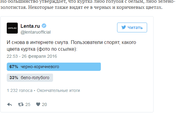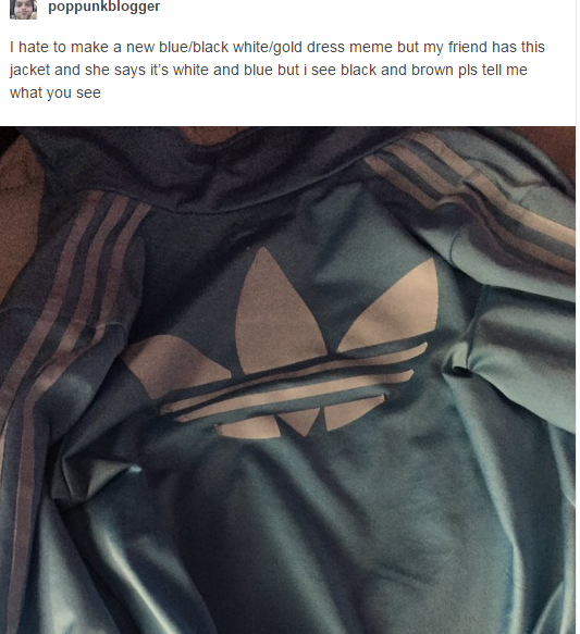 Одни уверяли, что куртка бело-голубого цвета, другие убеждали, что она черно-коричневая, а третьи – зелено-золотистая.