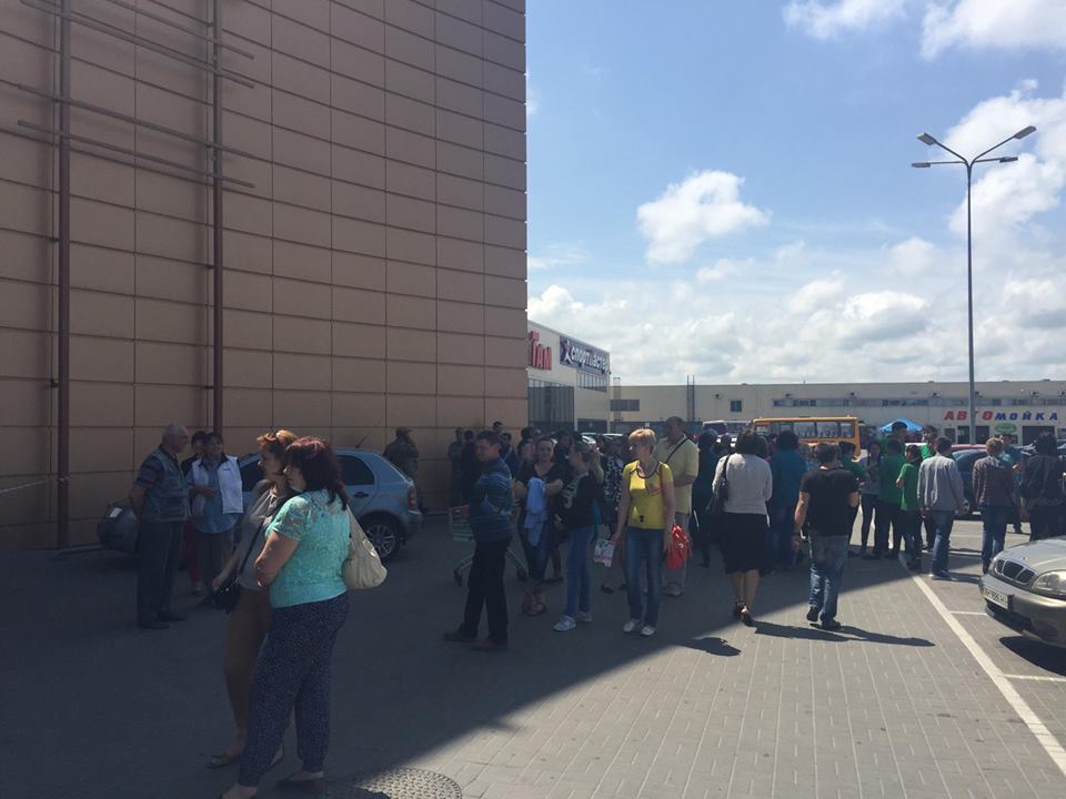 Люди при сопровождении покидают магазины и кинотеатры, на месте военные, полиция, ГСЧС и машины Скорой помощи.