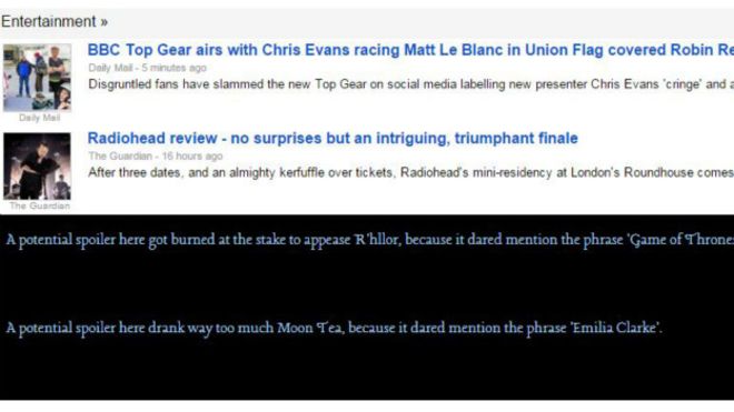 Данное расширение закрывает публикации в "Фейсбуке", "Твиттере", Reddit, а также на сайте Google News, которые потенциально могут содержать спойлеры. Пост закрашивается черным, а на его месте появляется шутливая надпись с указанием слов-триггеров, которые стали причиной блокировки. Это название сериала, а также имена ключевых его персонажей и актеров.