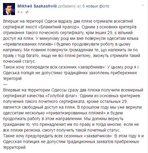 "В прошлом году мы уже вернули одесситам несколько "приватизированных пляжей" и будем продолжать работу в этом направлении. Мы должны вернуть гражданам то, что принадлежит им по праву, и тогда многие, если не все, пляжи региона, смогут получить такой почетный статус", - написал Саакашвили на своей странице в Facebook.