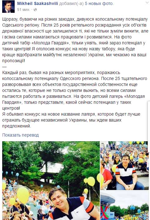 Саакашвили объявил конкурс на новое проукраинское название детского центра “Молодая гвардия”