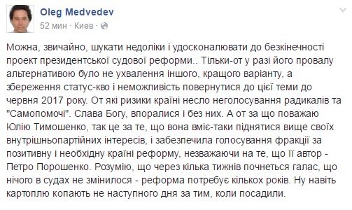 "Можно, конечно, искать недостатки и совершенствовать до бесконечности проект президентской судебной реформы .. Только вот в случае его провала альтернативой было не принятие другого, лучшего варианта, а сохранение статус-кво и невозможность вернуться к этой теме до июня 2017 года. Вот какие риски стране несло неголосование радикалов и "взаимопомощи". Слава Богу, справились и без них. А вот за что уважаю Юлию Тимошенко, так это за то, что она умеет же подняться выше своих внутрипартийных интересов, и обеспечила голосования фракции за положительную и необходимую стране реформу, несмотря на то, что ее автор - Петр Порошенко. Понимаю, что через несколько недель начнется шум, что ничего в судах не изменилось - реформа требует нескольких лет. Ну даже картошку копают не на следующий день по тому, когда посадили"? – пишет Олег Медведев.