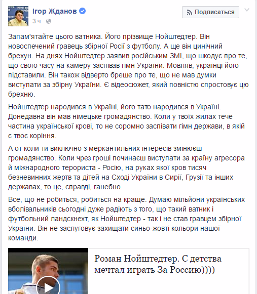 "Запомните этого ватника. Его фамилия Нойштедтер. Он новоиспеченный игрок сборной России по футболу. А еще он циничный врун. На днях Нойштедтер заявил российским СМИ, что жалеет о том, что в свое время на камеру спел гимн Украины. Мол, украинцы его подставили. Он также откровенно врет про то, что не собирался выступать за сборную Украины. Есть видеосюжет, который полностью опровергает это вранье", - заявил чиновник.