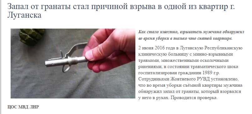 “Сотрудниками Жовтневого РУВД установлено, что во время уборки съемной квартиры мужчина обнаружил запал от гранаты, который взорвался у него в руках. Проводится проверка”, – заявили в ЦОС “МВД ЛНР”.