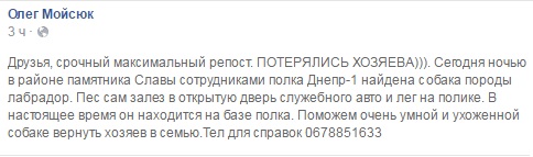 "Лабрадор был в ошейнике, но без поводка. Мы не знаем, что он любит есть, поэтому сварили ему кашу. Еда ему пришлась по вкусу и он с удовольствием уплел все приготовленное", - написал в Facebook сотрудник полка "Днепр-1" Олег Мойсюк.