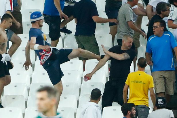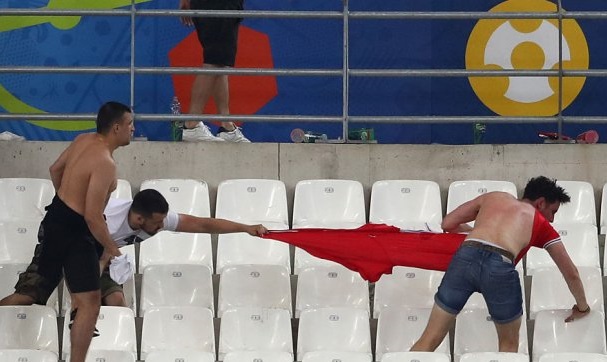 За несколько минут до конца игры, российские фаны бросили несколько ракетниц на поле и зажгли два файера. После того, они направились к трибуне с англичанами и попытались вырывать у них из рук флаги с национальными символами.
