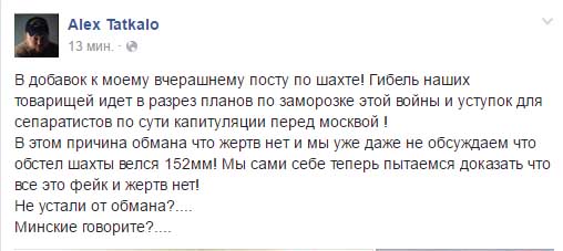 “По сути капитуляции перед Москвой ! В этом причина обмана, что жертв нет и мы уже даже не обсуждаем, что обстрел шахты велся 152-мм! Мы сами себе теперь пытаемся доказать что все это фейк и жертв нет!” - возмутился Таткало.