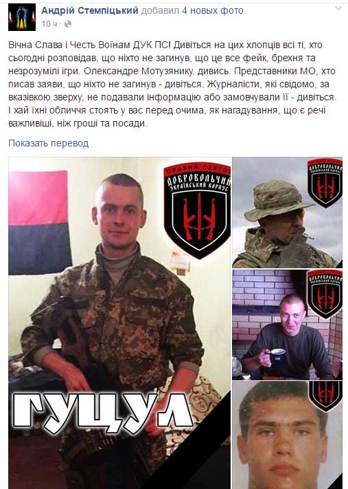 Главный командир в ВО "Тризуб" им. С. Бандери Андрей Стемпицкий опубликовал фото убитых военных с требованием к представителям Министерства обороны, Генштаба и спикерам по вопросам АТО из Администрации президента признать потери и понять, что человеческие жизни дороже должностей и денег.
