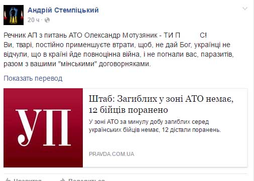 “Спикер АП по вопросам АТО Александр Мотузяник – ты п…с! Вы постоянно уменьшаете данные о потерях, чтобы, не дай Бог, украинцы не почувствовали, что в стране идет полноценная война, и не прогнали вас вместе с вашими "минскими" договорняками”, - написал он в соцсети.