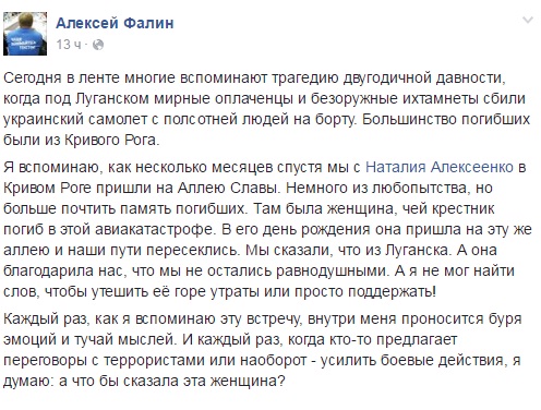 "…Мирные оплаченцы и безоружные "ихтамнеты" сбили украинский самолет с полсотней людей на борту. Большинство погибших были из Кривого Рога. Я вспоминаю, как несколько месяцев спустя мы с Наталия Алексеенко в Кривом Роге пришли на Аллею Славы. Немного из любопытства, но больше почтить память погибших. Там была женщина, чей крестник погиб в этой авиакатастрофе. В его день рождения она пришла на эту же аллею и наши пути пересеклись. Мы сказали, что из Луганска. А она благодарила нас, что мы не остались равнодушными. А я не мог найти слов, чтобы утешить её горе утраты или просто поддержать! Каждый раз, как я вспоминаю эту встречу, внутри меня проносится буря эмоций и туча мыслей. И каждый раз, когда кто-то предлагает переговоры с террористами или наоборот - усилить боевые действия, я думаю: а что бы сказала эта женщина?", - написал в соцсети Facebook тележурналист Алексей Фалин.