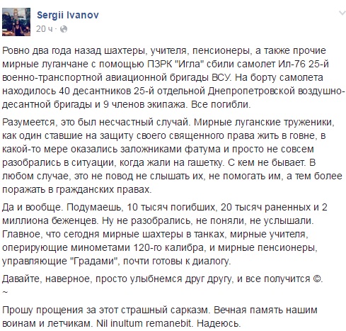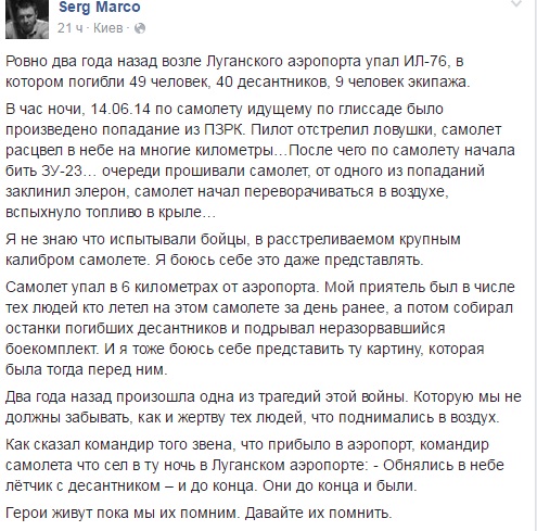 "Я не знаю, что испытывали бойцы, в расстреливаемом крупным калибром самолете. Я боюсь себе это даже представлять. Самолет упал в 6 километрах от аэропорта. Мой приятель был в числе тех людей, кто летел на этом самолете за день ранее, а потом собирал останки погибших десантников и подрывал неразорвавшийся боекомплект. И я тоже боюсь себе представить ту картину, которая была тогда перед ним. Два года назад произошла одна из трагедий этой войны. Которую мы не должны забывать, как и жертву тех людей, что поднимались в воздух. Как сказал командир того звена, что прибыло в аэропорт, командир самолета что сел в ту ночь в Луганском аэропорте: - Обнялись в небе лётчик с десантником – и до конца. Они до конца и были. Герои живут, пока мы их помним. Давайте их помнить".