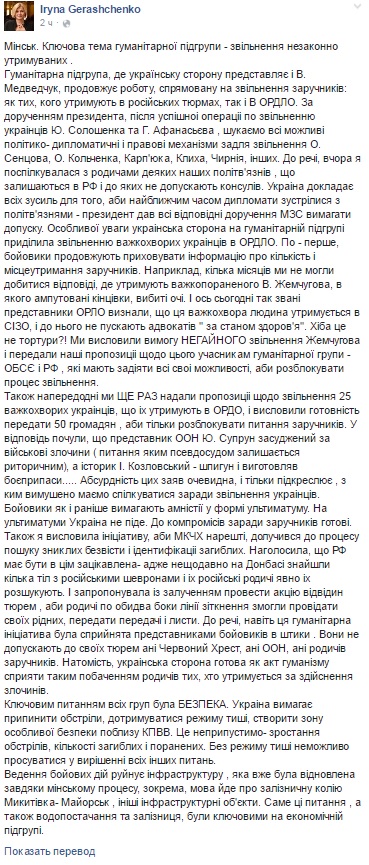 Как пишет она на своей странице в Facebook, главная тема сегодняшних переговоров – освобождение пленных осужденных украинцев, которые находятся в РФ. После освобождения Солошенко и Афанасьева, официальный Киев ищет способы освободить Сенцова, Кольченко, Карпюка, Клыха, Чирния и других.