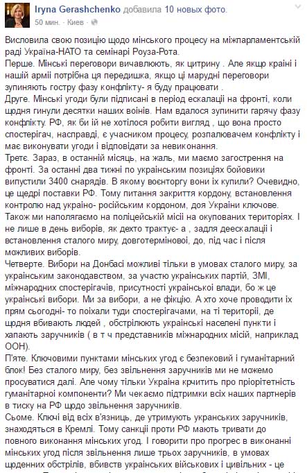 Первый вице-спикер Верховной Рады, представитель Украины в гуманитарной подгруппе трехсторонней контактной группы Ирина Геращенко на межпарламентском совете Украина - НАТО и семинаре Роуза-Рота выразила позицию относительно минского процесса.