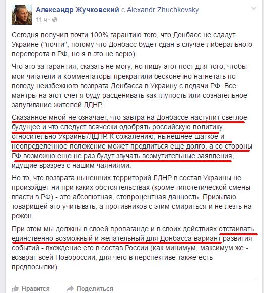 На своей странице в социальной сети он не стал указывать, что это за гарантия, но потребовал от читателей и подписчиков прекратить разговоры относительно “слива” Кремлем “ЛДНР”.