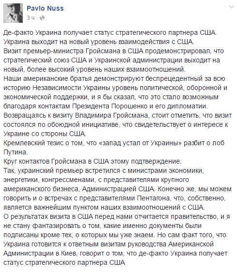 Украина выходит на новый уровень взаимодействия с Вашингтоном, фактически мы получаем статус стратегического союзника США – Павел Нусс