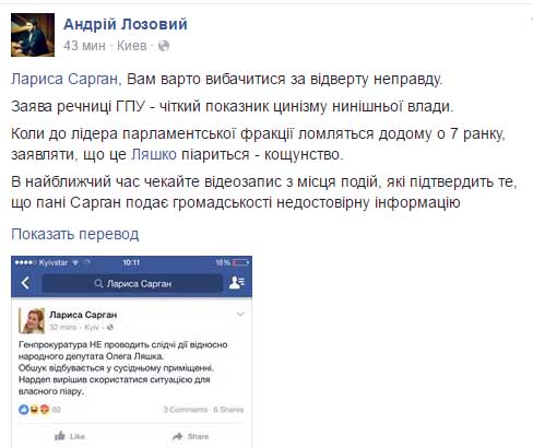 “Лариса Сарган, Вам нужно извиниться за откровенную ложь. Заявление спикера ГПУ - четкий показатель цинизма действующей власти… в ближайшее время ждите видеозапись с места событий, которая подтвердит, что госпожа Сарган предоставила общественности неправдивую информацию”, - написал Лозовой.
