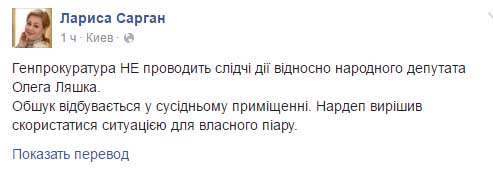 Пресс-секретарь Генерального прокурора Украины Лариса Сарган сообщила, что утром 21 июня представители Генпрокуратуры пришли с обыском не в дом парламентария Олега Ляшко, а к его соседям.