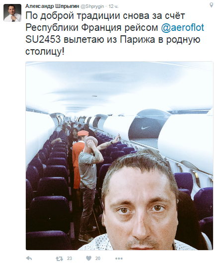 "По доброй традиции снова за счет Республики Франция рейсом SU2453 вылетаю из Парижа в родную столицу!" - написал он.