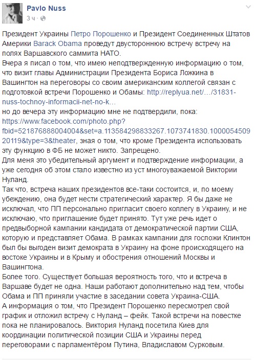 Известный политический аналитик Павел Нусс заявил о том, что информация о нежелании Президента Украины Петра Порошенко провести встречу с Государственным секретарем США Викторией Нуланд не соответствует действительности.