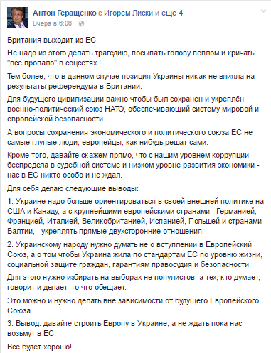 "Для будущего цивилизации важно, чтобы был сохранен и укреплен военно-политический союз НАТО, обеспечивающий систему мировой и европейской безопасности. А вопросы сохранения экономического и политического союза – ЕС, не самые глупые люди – европейцы как-нибудь решат сами", – отметил советник Авакова.