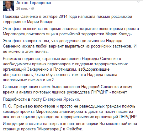 Надежда Савченко в октябре 2014 года написала письмо российской террористке Марии Коляде.