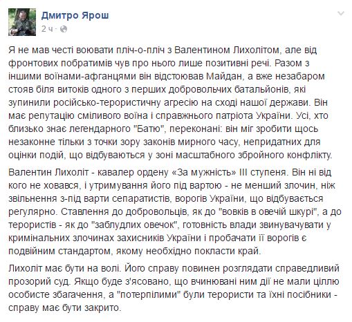 Дмитрий Ярош, возглавлявший некогда "Правый сектор", заявил о недопустимости содержания под стражей Валентина Лыхолита, известного в "Айдаре" как "Батя"