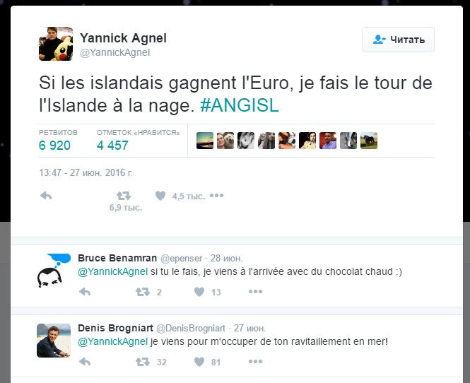 Француз Янник Аньель, двукратный олимпийский чемпион по плаванию, сообщил о том, что готов проплыть вокруг Исландии, если сборная этой островной страны одержит победу на французском чемпионате Европы по футболу.