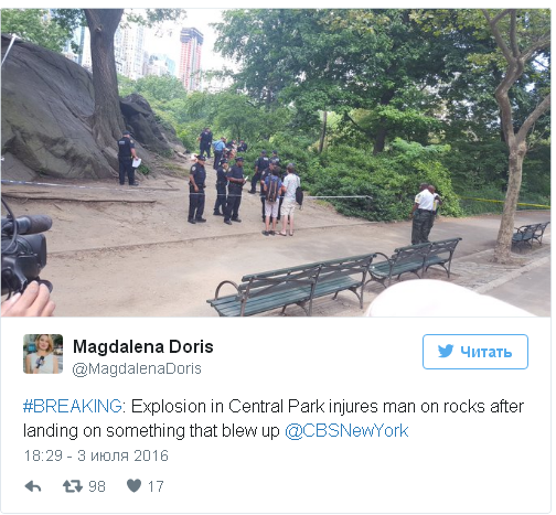 Сегодня, 3 июля, в Центральном парке города Нью-Йорка произошел взрыв, в результате которого мужчина получил ранение ноги.