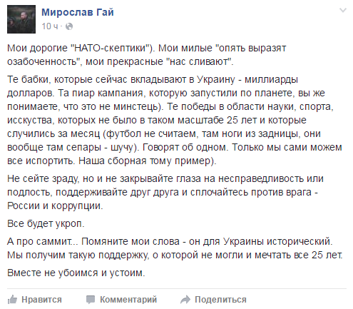 "А про саммит... Помяните мои слова - он для Украины исторический. Мы получим такую поддержку, о которой не могли и мечтать все 25 лет", - подвел итог Гай.