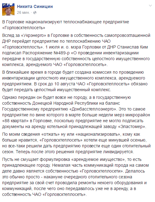 Как сообщает журналист Никита Синицин, “мэр” Горловки Станислав Ким подписал соответствующее распоряжение 1 июля. К 10 августа после инвентаризации целостного имущественного комплекса ЧАО “Горловсктеплосеть” отойдет “ДНР”. По данным корреспондента, предприятие перейдет не в собственность "республики", а "ГП “Донбасстеплоэнерго”, по вине которого в марте больше недели мерз микрорайон “88 квартал”.