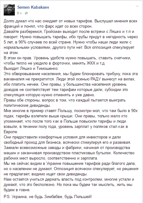 "Мы же сейчас видим в Украине повышение тарифов ради благого дела, но о населении не думают”, - уверен Кабакаев.