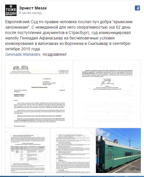 Жалоба жителя Крыма Геннадия Афанасьева на российских силовиков принята Европейским судом. По информации представителя правозащитной комиссии "Мемориал" в Республике Коми Эрнеста Мезака, ответ пришел "с невиданной оперативностью" – на 62 день после поступления документов в Страсбург.