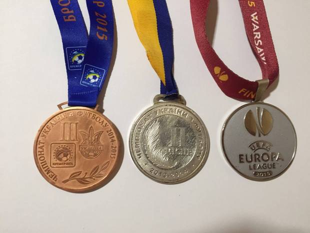 Так, на продажу выставлены: бронзовая медаль чемпионата Украины 2014-2015 (начальная цена 4 тыс. гривен), серебряная медаль чемпионата Украины 2013-2014 (оценена в 6 тыс. гривен) и дороже всего придется заплатить за серебряную медаль Лиги Европы 2015 (10 тыс. гривен).