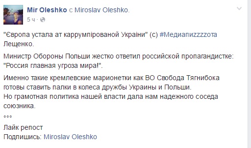 Об этом пишет на своей странице в социальной сети Facebook блогер Мирослав Олешко.