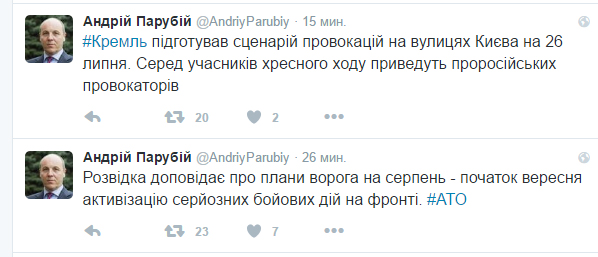 По данным председателя Верховной Рады, уже через пару недель, 26 июля, в Киеве при участии пророссийских провокаторов будет сорван крестный ход православных верующих в Киеве. Об этом Парубий написал в Twitter. Предполагается, что провокаторы появятся в столице с запрещенной в Украине символикой, а также с российскими флагами.