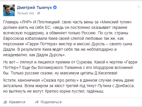 “Ну вот – ляпнул и лишился премии от Суркова. Какой к чертям "Гарри Поттер"? Еще бы богомерзкого Толкиена с его Мордором вспомнил бы. Только русские сказки, ну максимум цитаты Д. Киселева!” – рекомендовал террористу военный экспрерт.